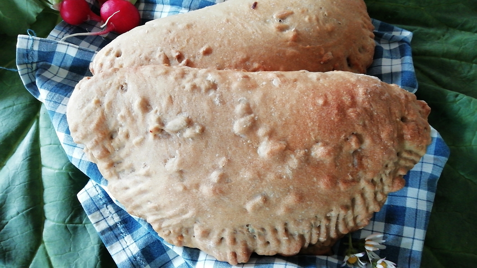 - Brotfladen zuklappen (wie Calzone) und den Rand mit einer Gabel andrücken.