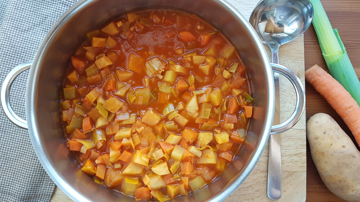 - Wasser und Gemüsebrühe mischen und das Gemüse damit ablöschen und einkochen lassen.