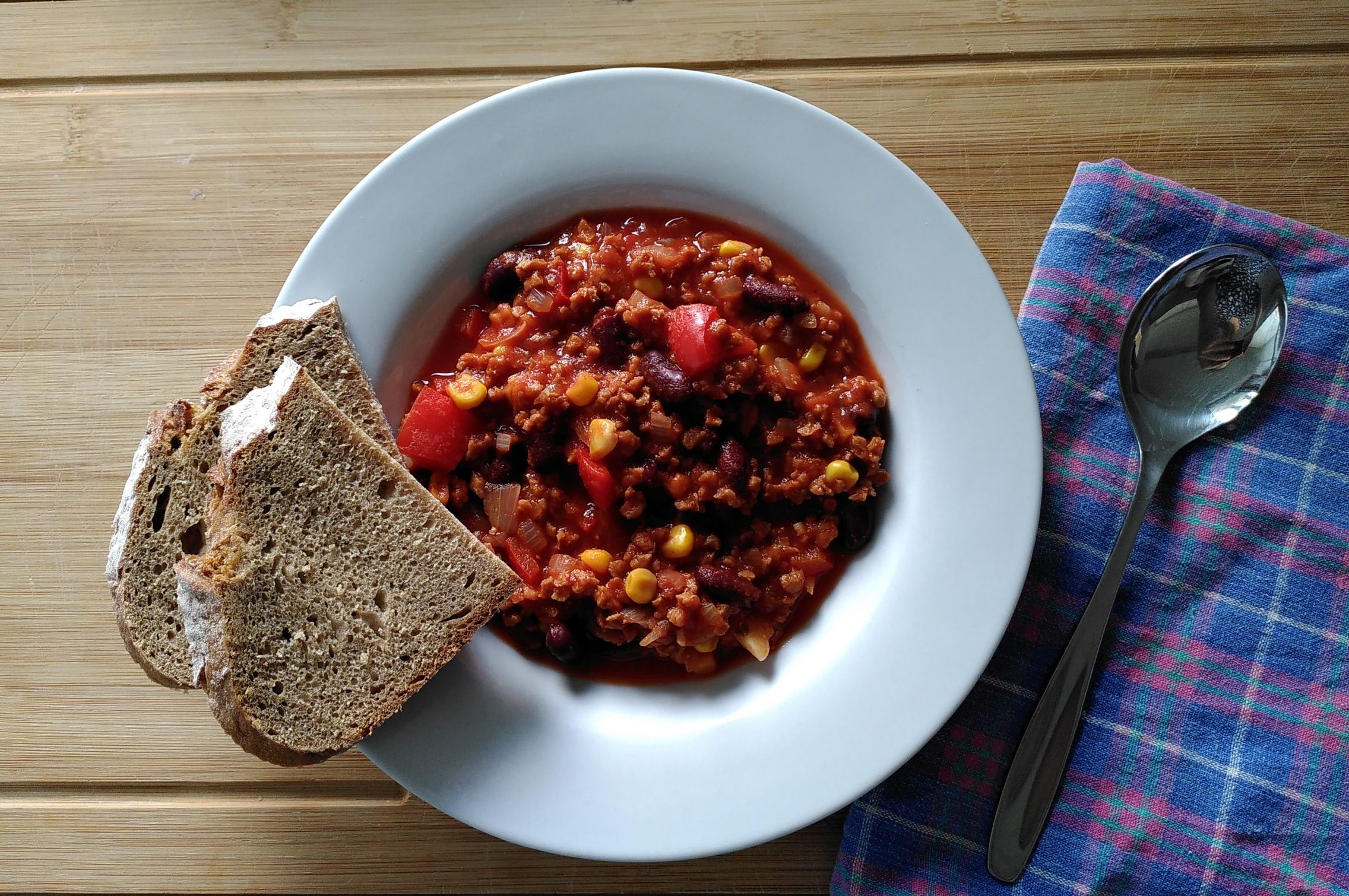 - Paprika in kleine Stücke schneiden. Gemeinsam mit abgetropftem Mais und Kidneybohnen, den passierten Tomatenmark sowie Tomaten in den Topf geben.