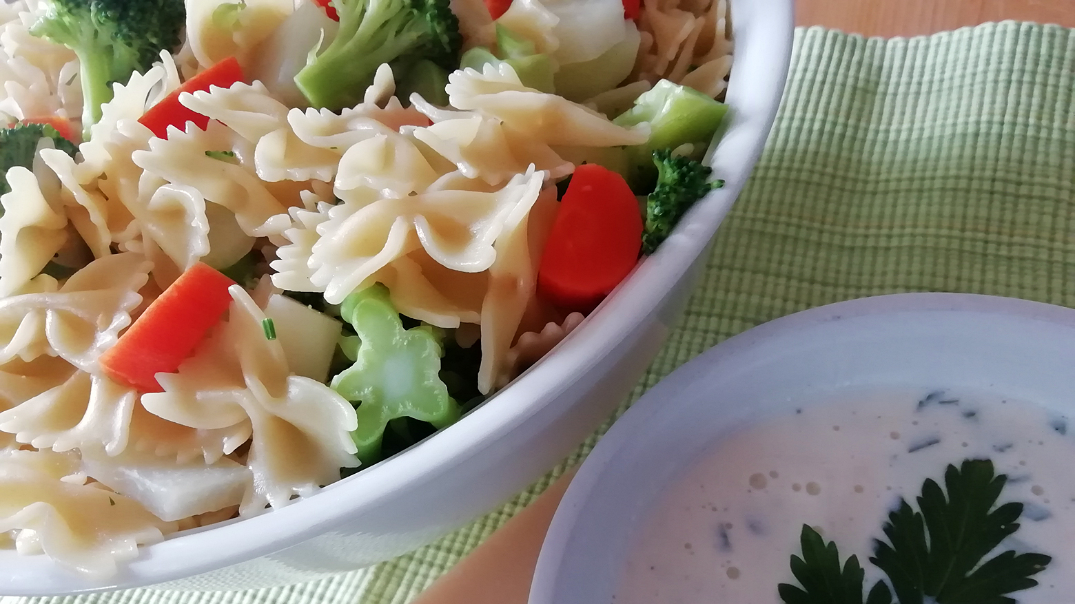 - Mit Salz, Pfeffer und Muskat die Soße würzig abschmecken. Nudeln und Gemüse zur Soße geben und miteinander vermischen, anrichten.
