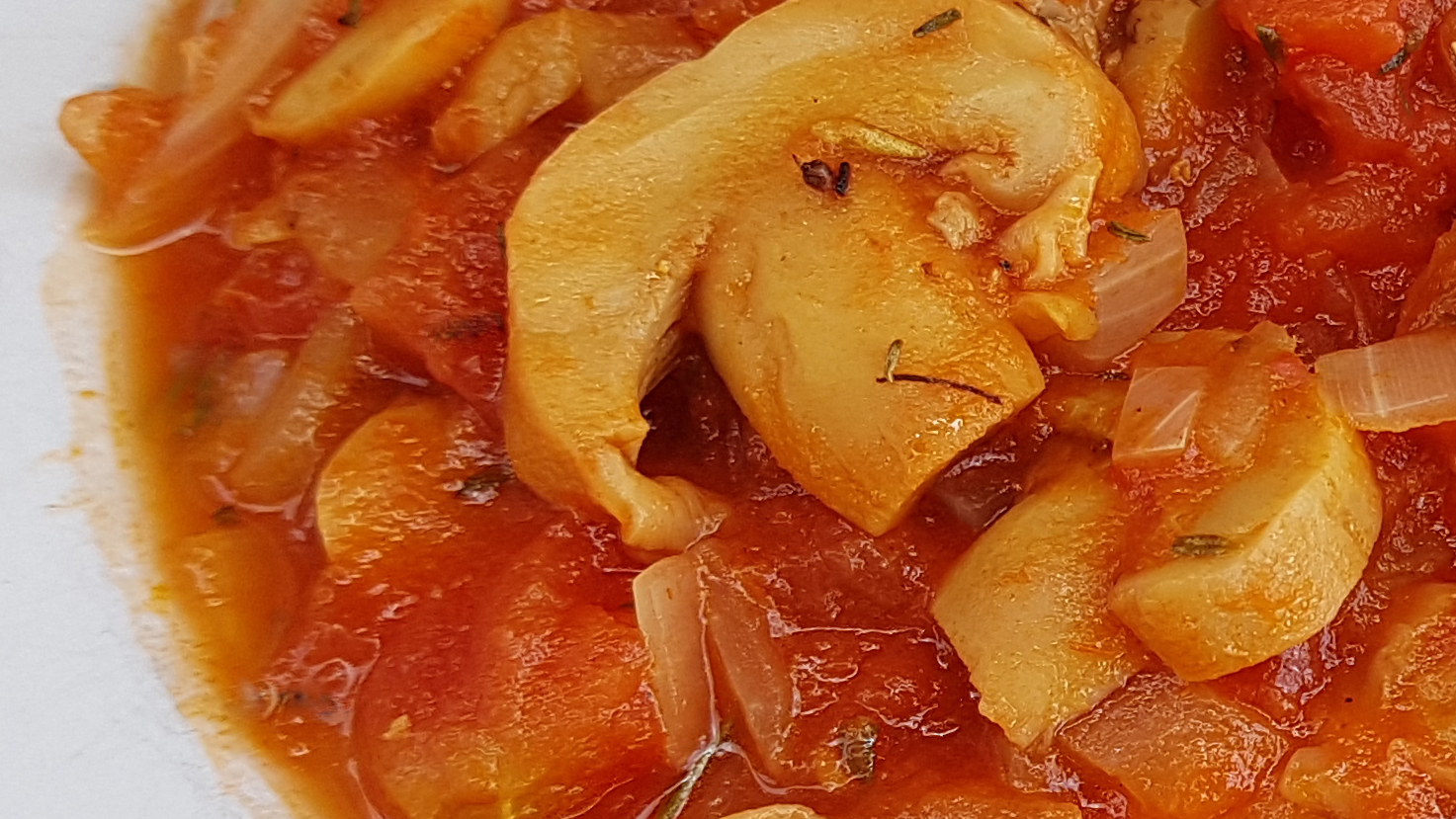 - In einem Topf das Öl erhitzen, Zwiebeln darin glasig dünsten, Champignons hinzufügen und alles 3 min dünsten.